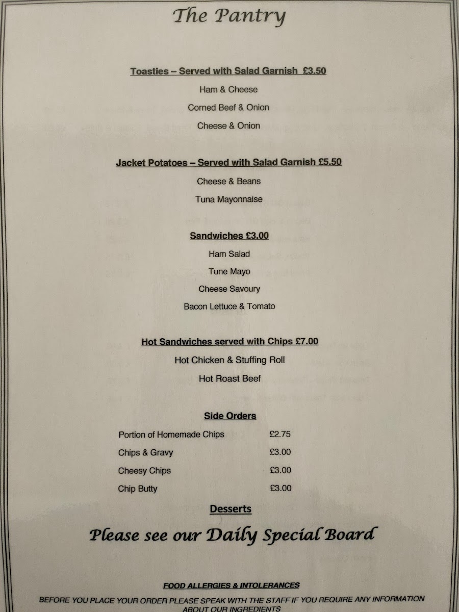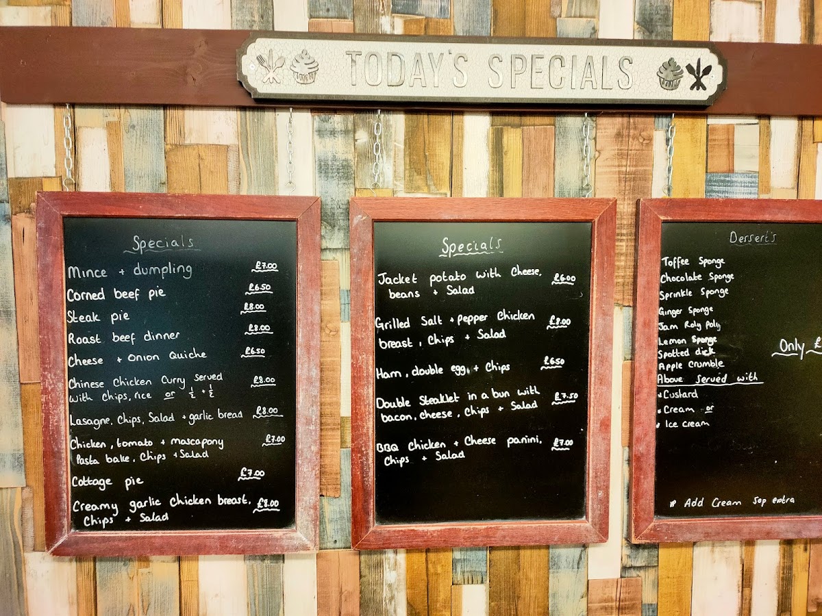 - Main Meals: A selection of home-cooked dishes including pies, paninis, pasta dishes, quiches, and traditional meals like meatloaf, hunters chicken, lasagne with chips, salad and garlic bread. Specific main meal options may vary daily.